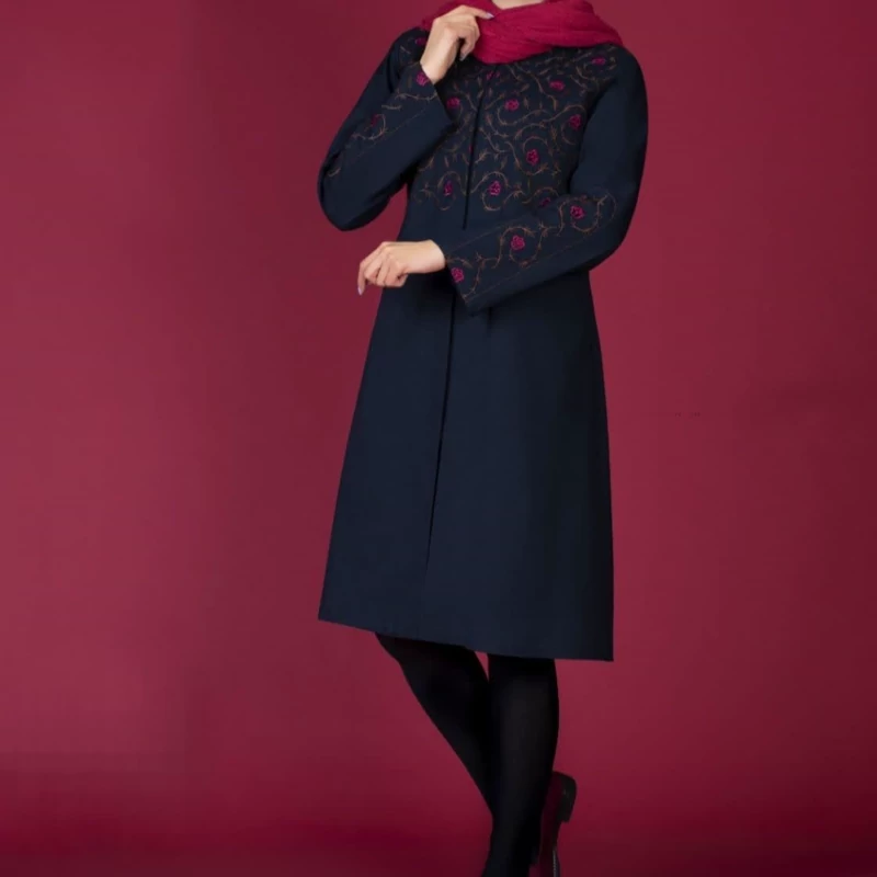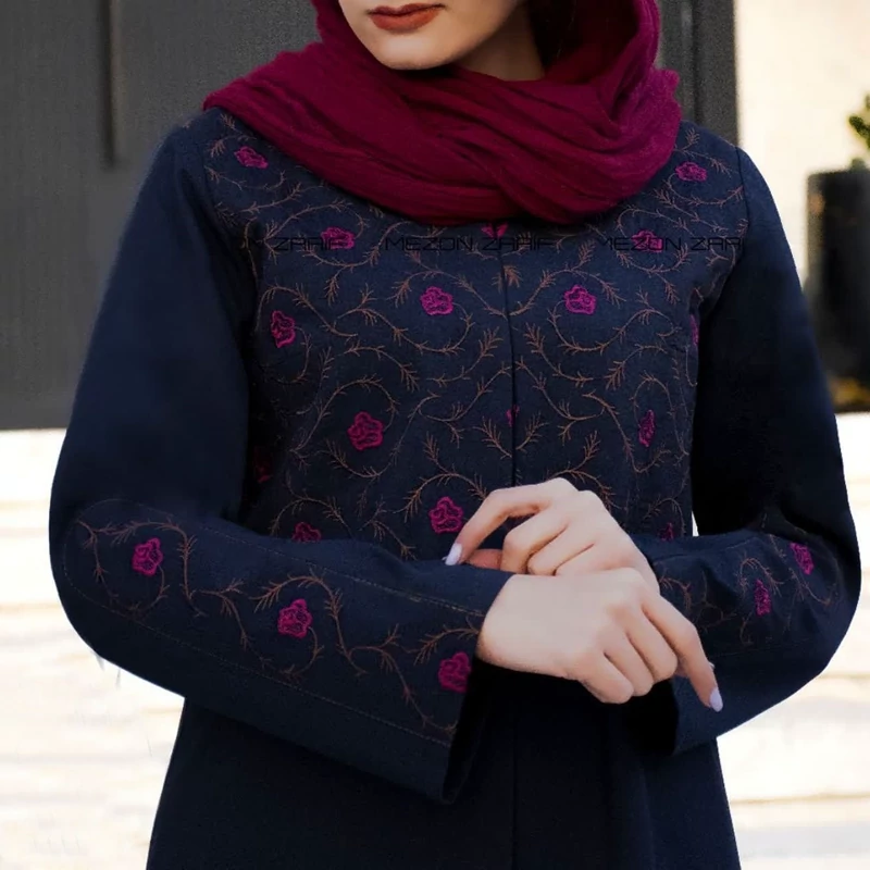 مانتو مجلسی زنانه گلدوزی شده سایز بزرگ از سایز40تا 50 دو رنگ، سورمه ای مشکی قد حدود 106 تا110 جدول سایز اسلاید اخره