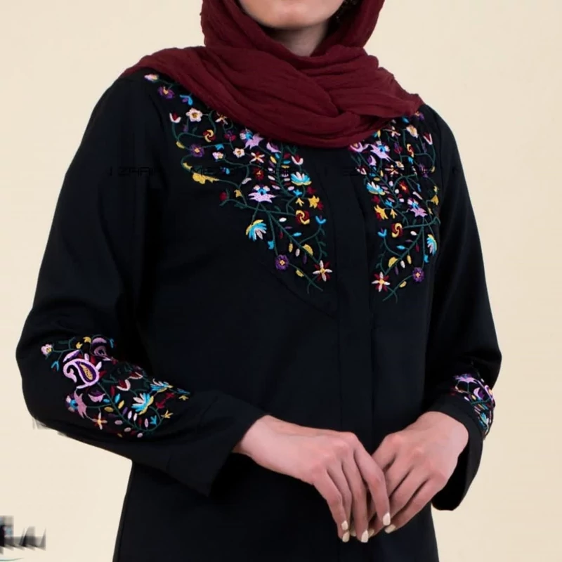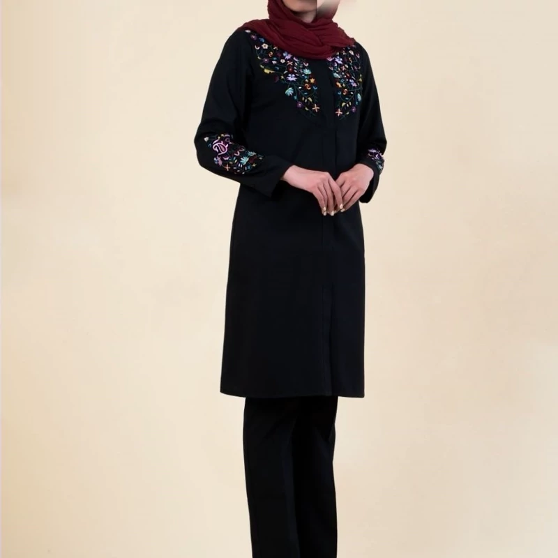 مانتوشلوار دکمه دار گلدوزی شده مشکی و سورمه ای